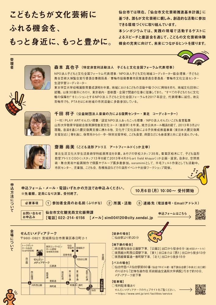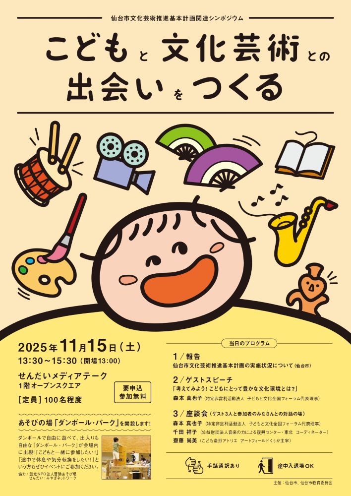 仙台市より仙台市文化芸術推進基本計画関連シンポジウム「こどもと文化芸術との出会いをつくる」のご案内をいただきました。詳細はチラシをご覧ください。