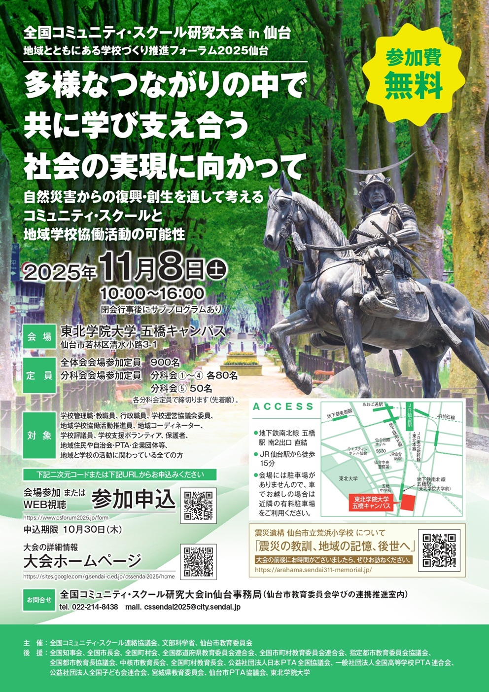 【イベント案内】全国コミュニティ・スクール研究大会in仙台 地域とともにある学校づくり推進フォーラム2025仙台 (主催: 全国コミュニティ・スクール連絡協議会、文部科学省、仙台市教育委員会)