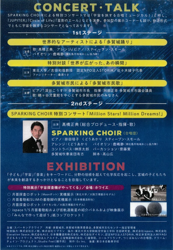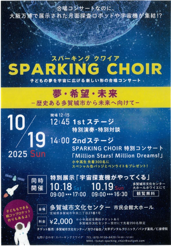 SPARKING CHOIRによる特別コンサートでは「宇宙を旅する合唱ミュージカル!」と称し、「JUPITER」「Circle of Life」「星影のエール」などを演奏。参加型の展示コーナーも設け、物語形式でともに宇宙を旅するコンサートとなっております。