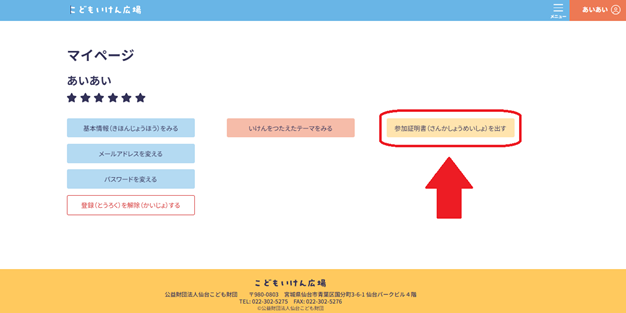 ②「マイページ」にある「参加証明書を出す」ボタンからダウンロードする