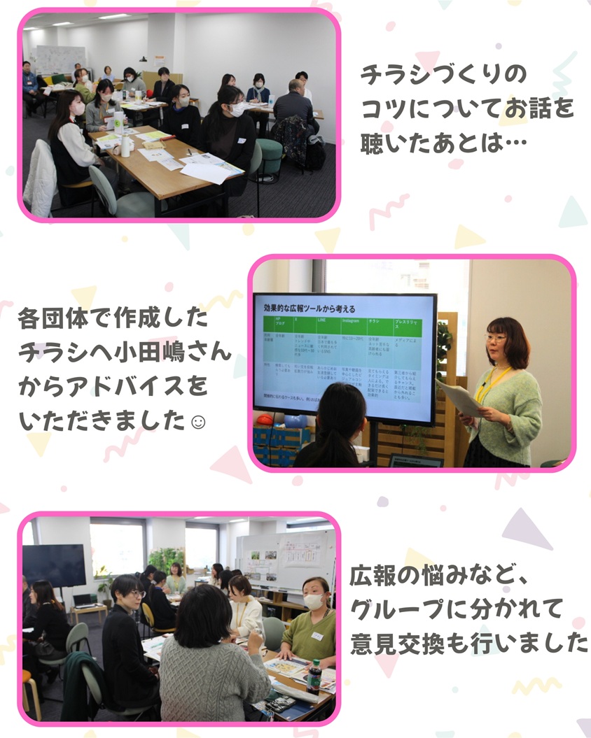 実際に各団体で作成したチラシを持ち寄り、アドバイスをいただくなど、実践的でとても有意義な時間となりました。