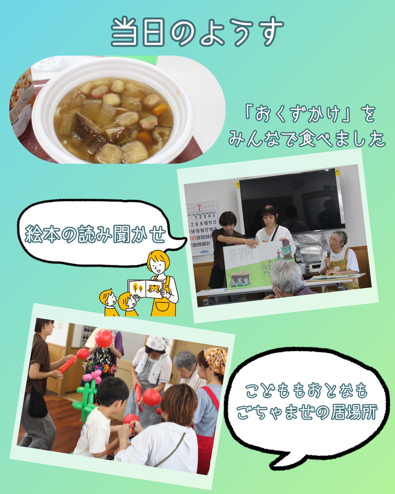 活動のきっかけになった民生委員の草野さんが進行を務めるほか、得意の紙芝居を皆さんに聞かせてくださいました。また、パフォーマーの方によるバルーンアートも披露されました。食事の準備をしている間は、市社協職員の方や財団から持ち寄られたお手製のおもちゃで楽しみました。