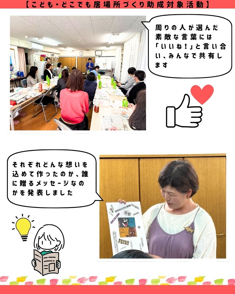 最後にそれぞれ作った作品を披露。選んだ言葉や組み合わせ、貼り方などに「その人らしさ」が出ていて、発表の間も「素敵!」「いいね!」の声が飛び交っていました。